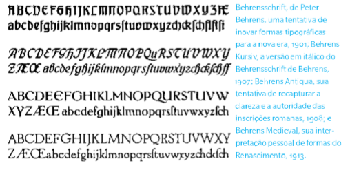 “BEHRENSSCHRIFT era uma tentativa de reduzir todo o floreado poético que marcasse as formas, e com isso torná-las mais universais” (Meggs, 2009, pg .300). Destacando-se assim dos tipos mais utilizados na época e diferenciando-se pela utilização de traços padronizados, numa combinação do caráter pesado e estreito da letra gótica com as proporções das antigas inscrições romanas. O que resultou numa perfeita combinação tanto na composição de livretos quanto em artefatos impressos.