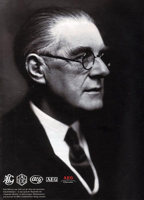 O artista, arquiteto e designer alemão Peter Behrens desempenhou papel importante ao planejar um curso de design na primeira década do novo século. Ele buscava a reforma tipográfica, foi o primeiro defensor da tipografia sem serifas e usou um sistema de grids para estruturar o espaço em seus leiautes. Foi chamado de “o primeiro designer industrial” em reconhecimento aos seus projetos para produtos industrializados […] Seu trabalho para a Allgemeine Elektrizitats-Gesellschaft, ou AEG é considerado o primeiro programa completo de identidade visual. Em arquitetura, seus primeiros edifícios foram pioneiros no uso das cortinas de vidro não estruturais. (MEGGS, 2009, pg 298)